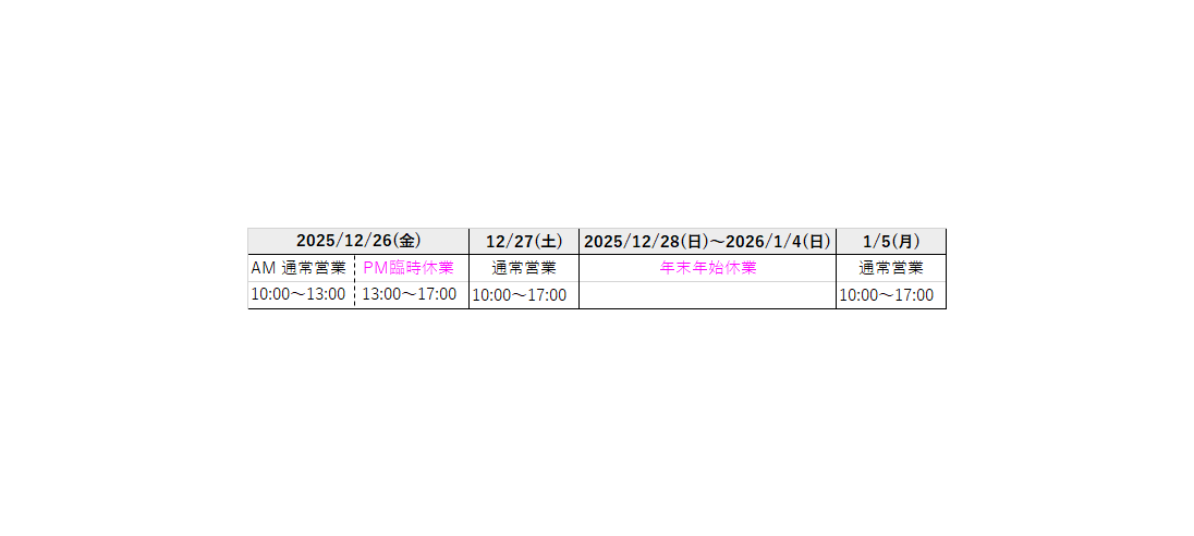 平素は格別のご高配を賜り、厚くお礼申し上げます。 誠に勝手ながら、年末年始休業日を下記のとおりとさせていただきます。 休業日 2025年12月29日(日)~2026年1月4日(日) ※1/5(月)より通常営業いたします。 休業期間中、お客様には大変ご迷惑をおかけいたしますが 何卒ご理解を賜りますようお願い申し上げます。